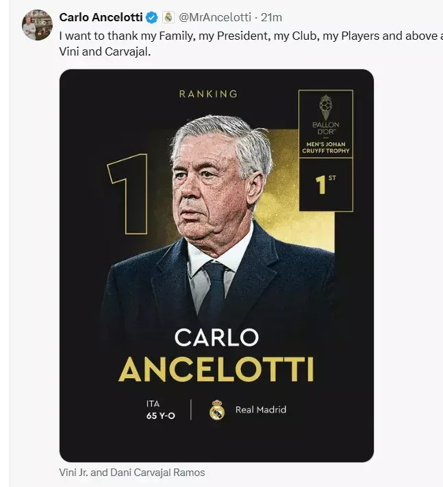 安切洛蒂社媒示意说念:我要感谢我的家东说念主,我的主席,我的俱乐部,我的球员,尤其是维尼修斯和卡瓦哈尔。